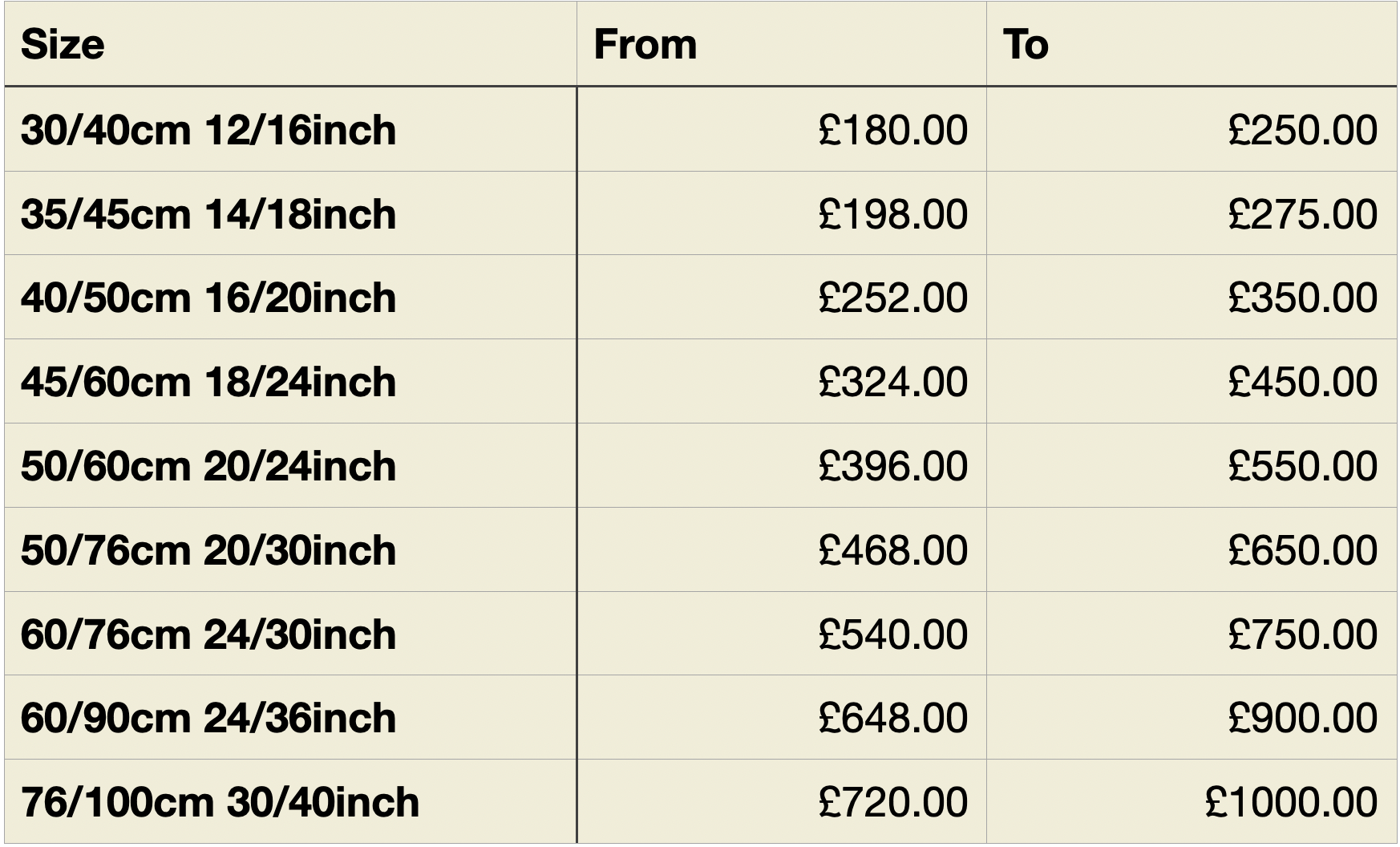 The table provides an indication of price ranges for commissioned work. The rice shown encompasses the cost of materials, time spent on the work and shipping to locations within the UK. Additional costs may be incurred for international work. The price also allows for three changes to the work during the two check points. Changes beyond this may incur further costs which will be discussed at the time of the request.